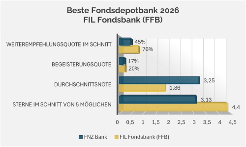 Die FNZ Bank SE (vormals ebase) liegt an zweiter Stelle und es wurde die Preispolitik positiv genannt, auch Innovation und Technik wurden vereinzelnd positiv erwähnt, aber es gibt auch erhebliche Verbesserungspotentiale mit dem Endkundenportal, Profiportal, Kundenbetreuung und WP-Ordering.Wir gratulieren der FIL Fondsbank (FFB) zum wieder zum Gewinn als „Beste Fondsdepotbank“ 2026.