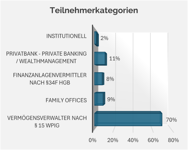 Wir geben Ihnen bei der Auswertung der Umfrage zur Zufriedenheit mit Depotbanken einen Überblick wie sich die Teilnehmenden aufteilen und auf wie viele Depotbanken sich das Geschäft einzelner Vermögensverwalter verteilt.