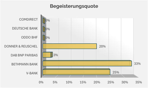 Doch die Detailanalyse zeigt: Hinter dem Durchschnitt verbergen sich deutliche Unterschiede zwischen den einzelnen Instituten. Wirklich begeistert sind lediglich 7 % der Befragten. Die Kommentare machen klar, dass hier weiterhin Potenzial nach oben besteht. Eine Rückmeldung bringt es auf den Punkt: „Wie soll ich meinen Kunden die Depotbank näherbringen, wenn ich selbst noch nicht überzeugt bin?“
