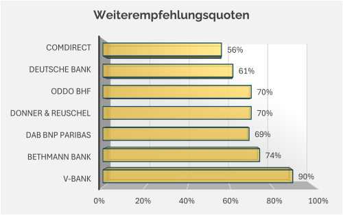 Wichtig auch die Frage nach der Motivation eine Bank weiterzuempfehlen, auch in diesem Punkt gibt es deutliche Varianzen zwischen den Depotbanken.