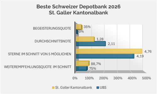 Bei den Depotbanken mit Konto- und Depotführung in der Schweiz gibt es eine klare Gewinnerin es ist die St. Galler Kantonalbank vor der Zweitplatzierten UBS.