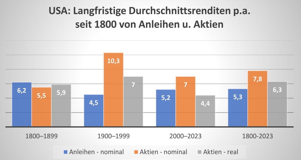Das Schaubild zu den Anleiherenditen zeigt, dass deren langfristigen Durchschnittswerte über 224 Jahre weniger schwankten als Aktienrenditen. US-(Staats-)Anleihen erzielten im 19. Jahrhundert – je nach Studie – Nominal-Renditen von 5,1 bis 6,2 Prozent pro Jahr, im 20. Jahrhundert von 4,4 bis 4,9 Prozent, im ersten Viertel des 21. Jahrhunderts 4,9 bis 5,5 Prozent.