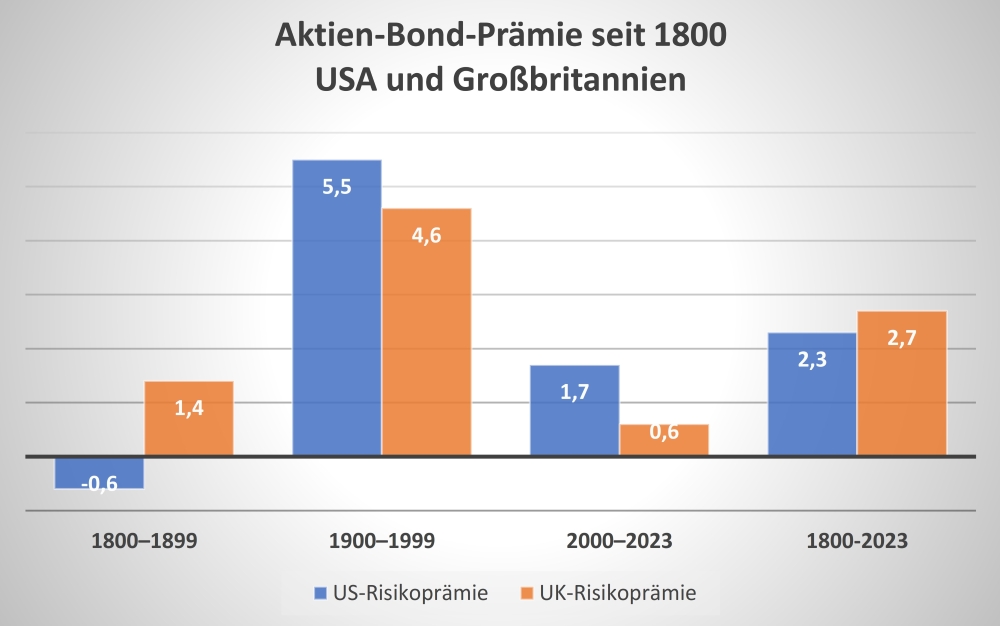 Die US-Aktienprämie gegenüber (Staats-)Anleihen für das 19. Jahrhundert liegt je nach Studie mit Werten zwischen 1,6 % und -0,6 %, so dass Aktien im 19. Jahrhundert in den USA möglicherweise sogar schlechter performten als Anleihen. Weil die sichersten damaligen US-Bonds jedoch nicht risikofrei gewesen seien, halten die Autoren eine leicht positive Prämie für am wahrscheinlichsten. Im 20. Jahrhundert war die US-Aktienprämie mit rund 5,5 Prozent ausgeprägt positiv. Im Zeitraum 2000 bis 2023 fiel sie jedoch im Durchschnitt wieder auf 1,7 Prozent zurück. Im 224-Jahre-Zeitabschnitt betrug diese Prämie in den USA, je nach Studie, 2,1 bis 3,7 Prozent p.a.