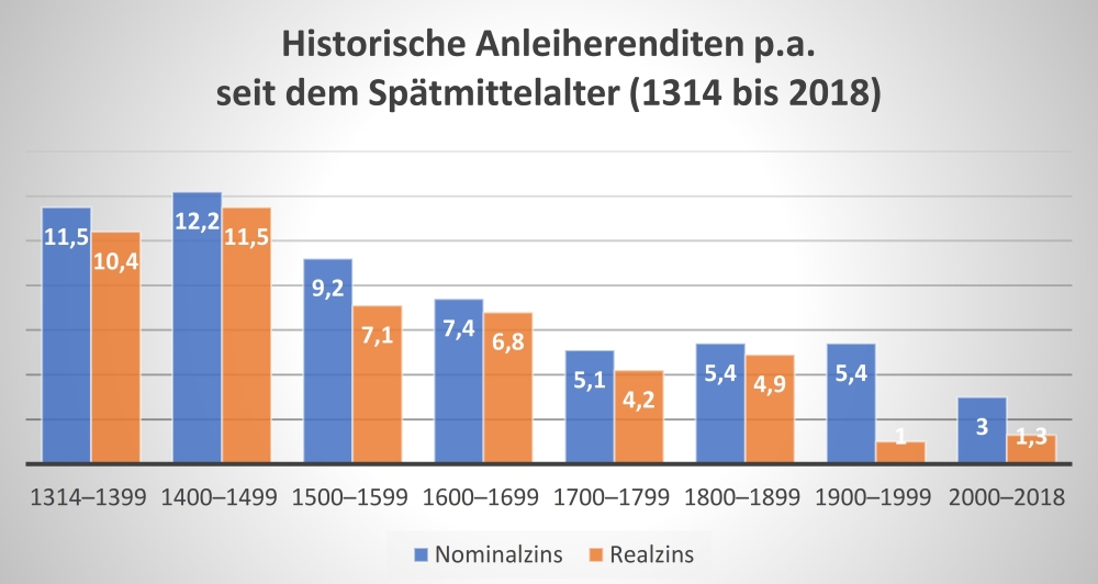 Die nominalen und realen Renditen fielen im Trend über 7 Jahrhunderte: im ausgehenden Spätmittelalter waren sie zweistellig, in der Zeit um die Industrielle Revolution gingen sie auf etwa 5 Prozent zurück und auch danach sanken sie immer weiter. Real- und schließlich auch Nominalrenditen fielen vor noch nicht allzu langer Zeit in den negativen Bereich mit Rekordtiefständen.