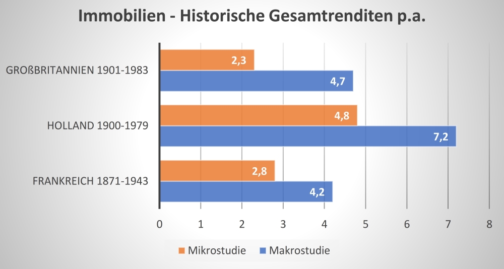 Wissenschaftliche Studien zu Immobilien-Renditen sind nach Auskunft der Autoren relativ stark auf Wohnimmobilien fixiert. Dabei gebe es zwei Herangehensweisen: zum einen die makroökonomische (aggregierten nationalen statistischen Indexreihen für Hauspreise und Mieten), zum anderen die mikroökonomische (detaillierte Transaktionspreise auf Objektebene, realisierte Mieten usw.). Weil es für Immobilien weit schwieriger sei als etwa für Aktien, die erforderlichen Mikrodaten in ausreichender Qualität und Quantität zu beschaffen, gebe es nur wenige, vom Ergebnis her heterogene Mikrostudien zu Immobilien-Renditen in der langen Frist. Aufgrund der Datenprobleme werde häufig auf einen Makroansatz zurückgegriffen. Einer solchen Studie zufolge erzielten Immobilien im Zeitraum von 1870 bis 2015 im Durchschnitt eine Gesamtrendite mindestens in der Höhe von Aktien. Über alle Länder hinweg betrug die gleichgewichtete reale Rendite 7,3 Prozent (Aktien 6,7 %). Gewichtete man nach BIP rangierten Immobilien mit 6,7 Prozent leicht hinter Aktien (7,1 %).